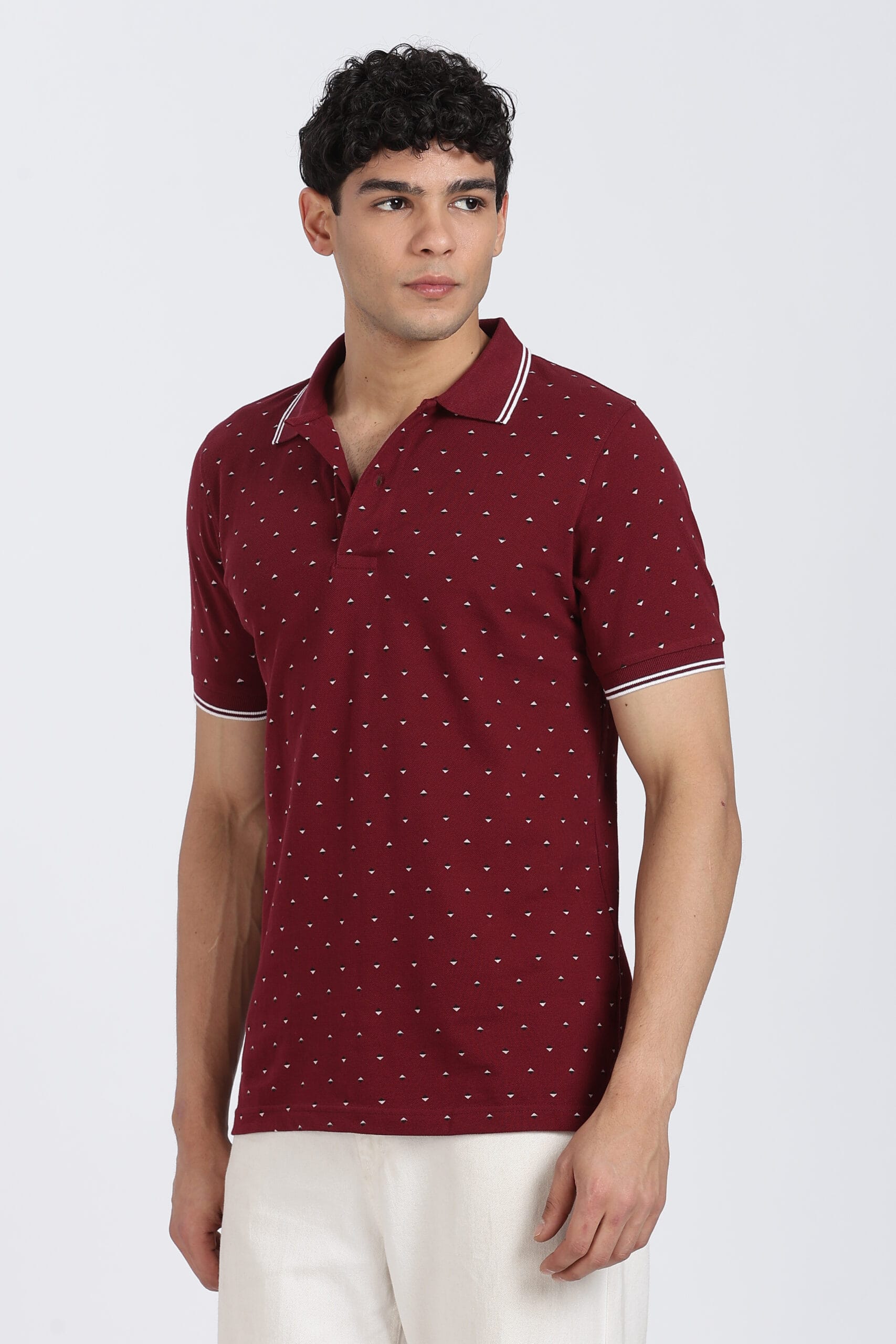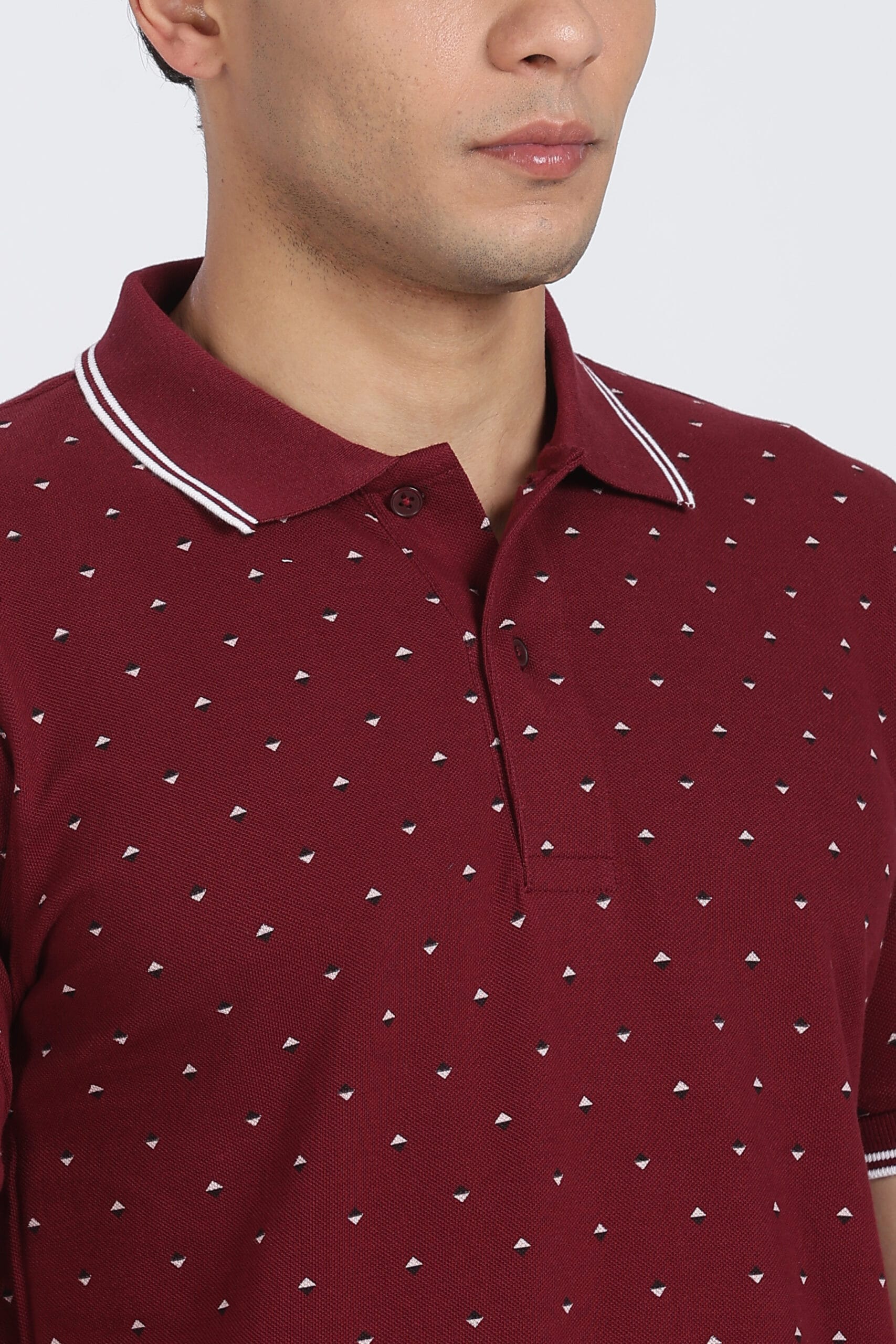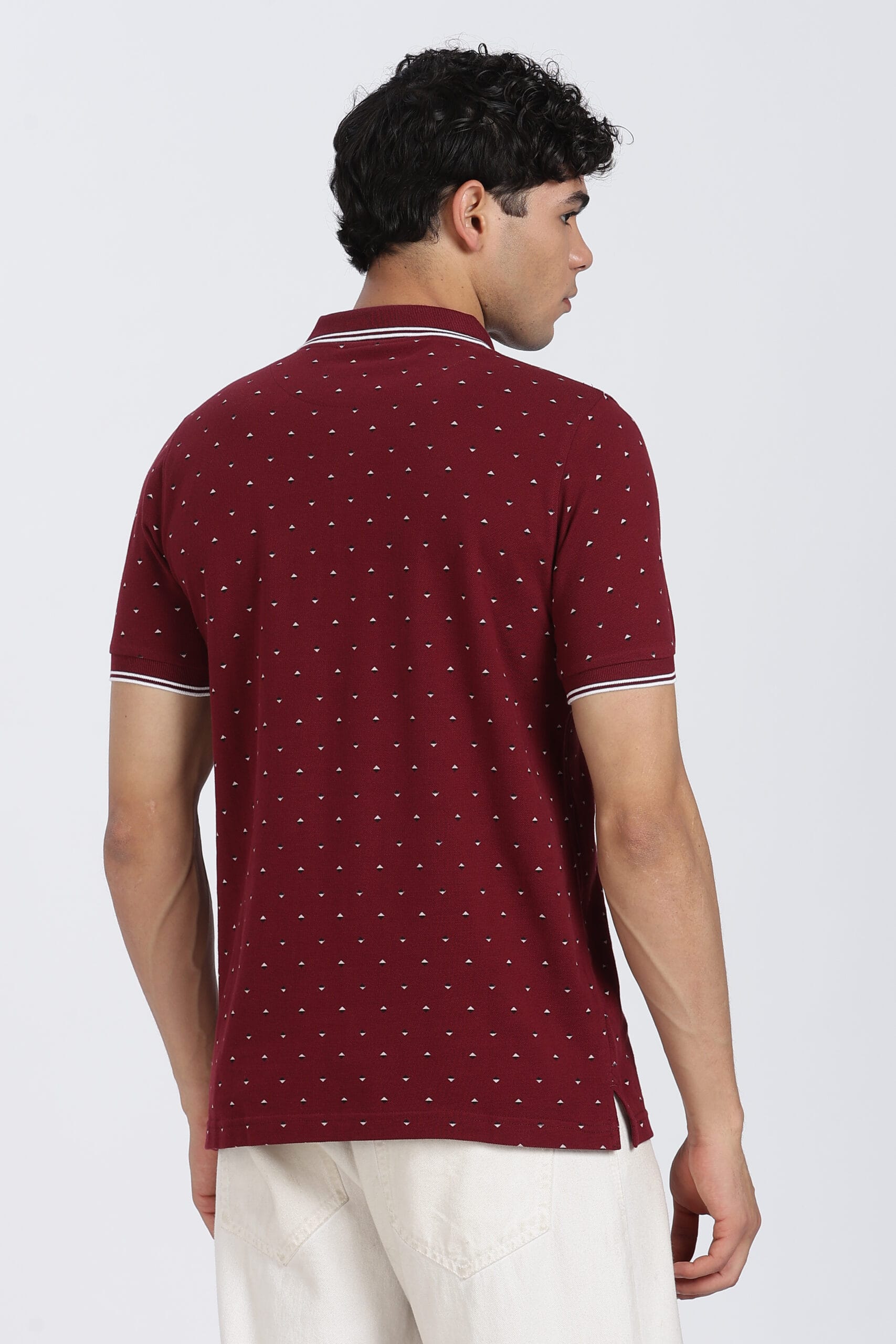 The micro geometric print design adds a refined visual texture, while the contrast tipped collar enhances the overall premium appeal. Designed with a regular fit, it provides ease of movement and a relaxed silhouette, making it perfect for daily wear.