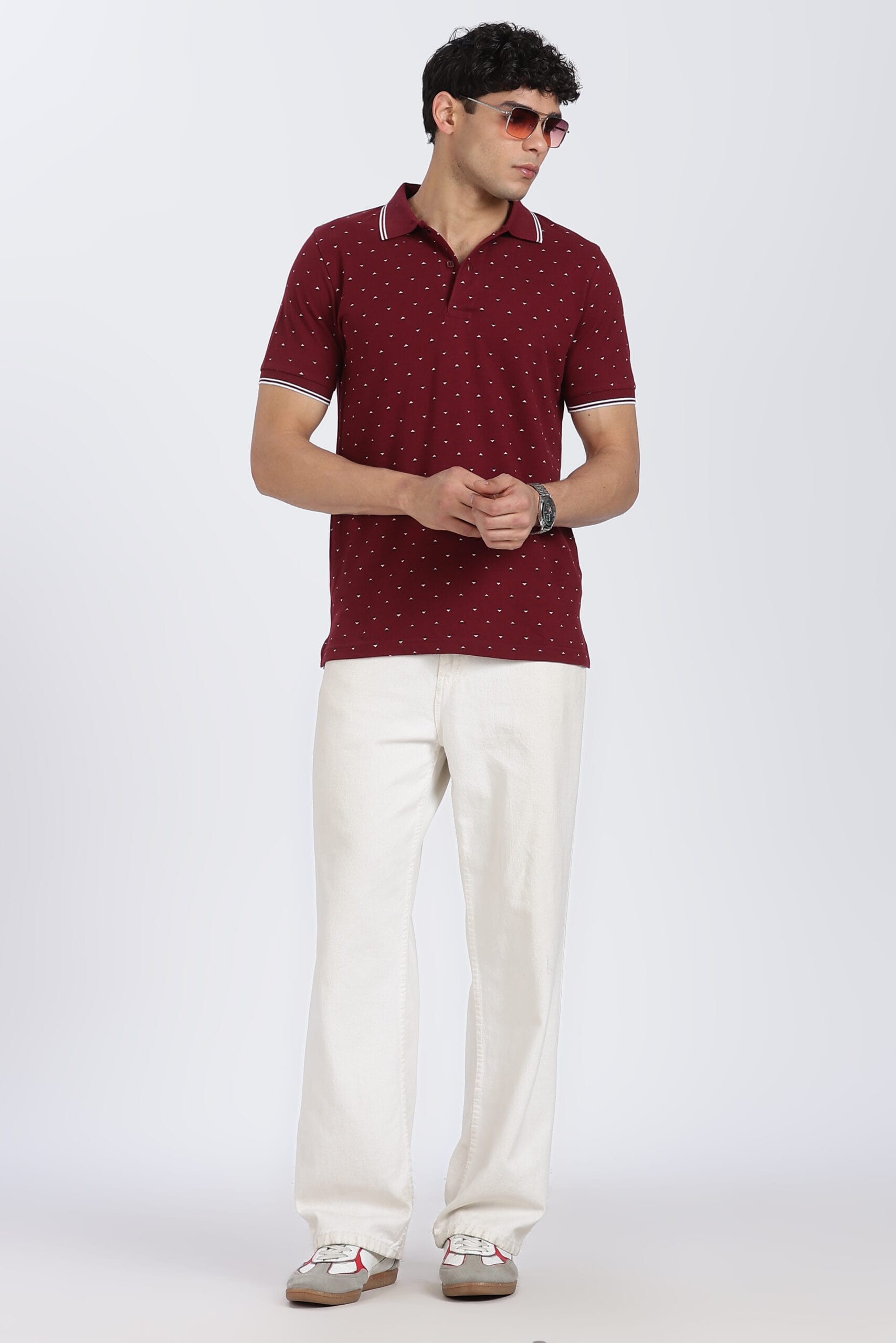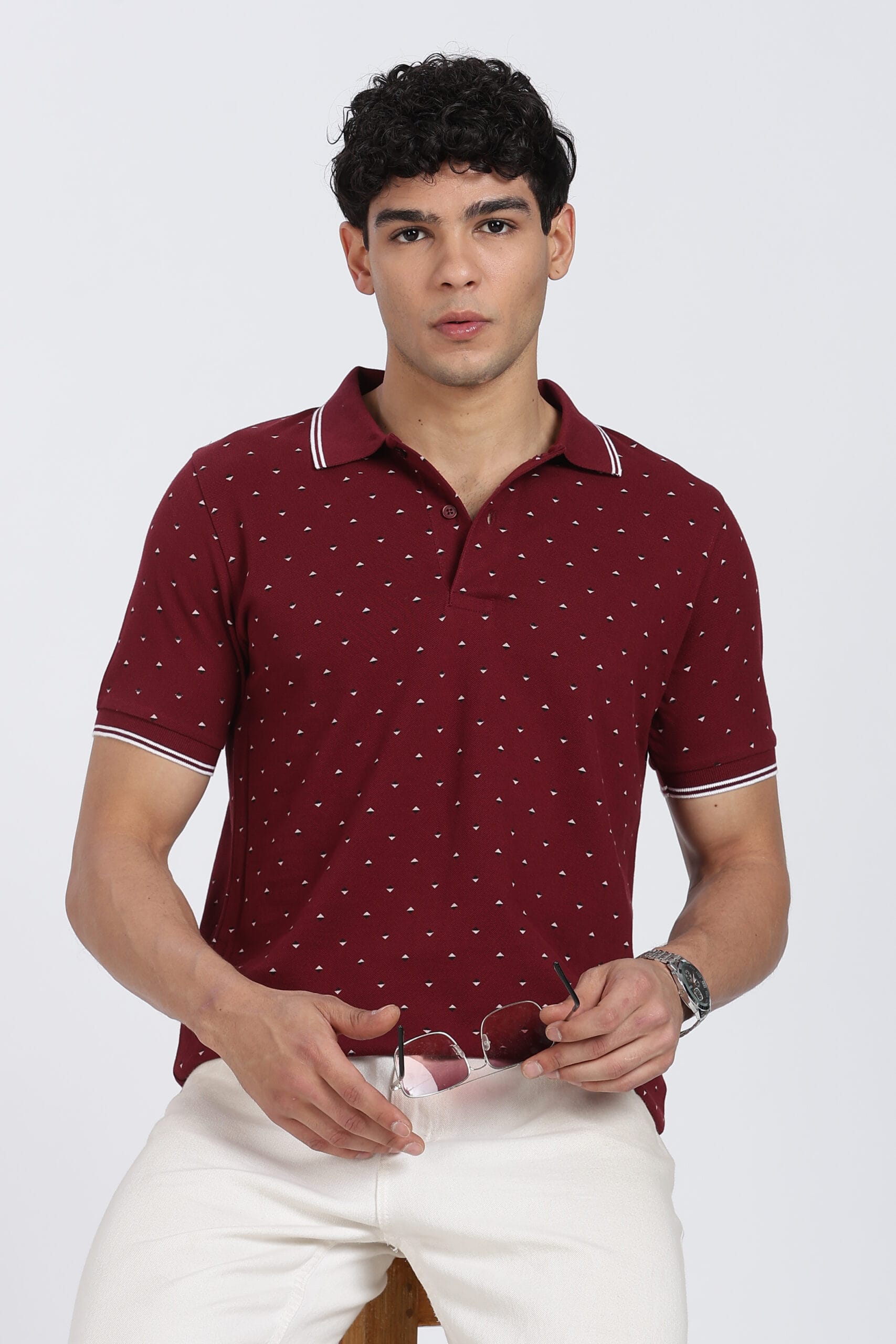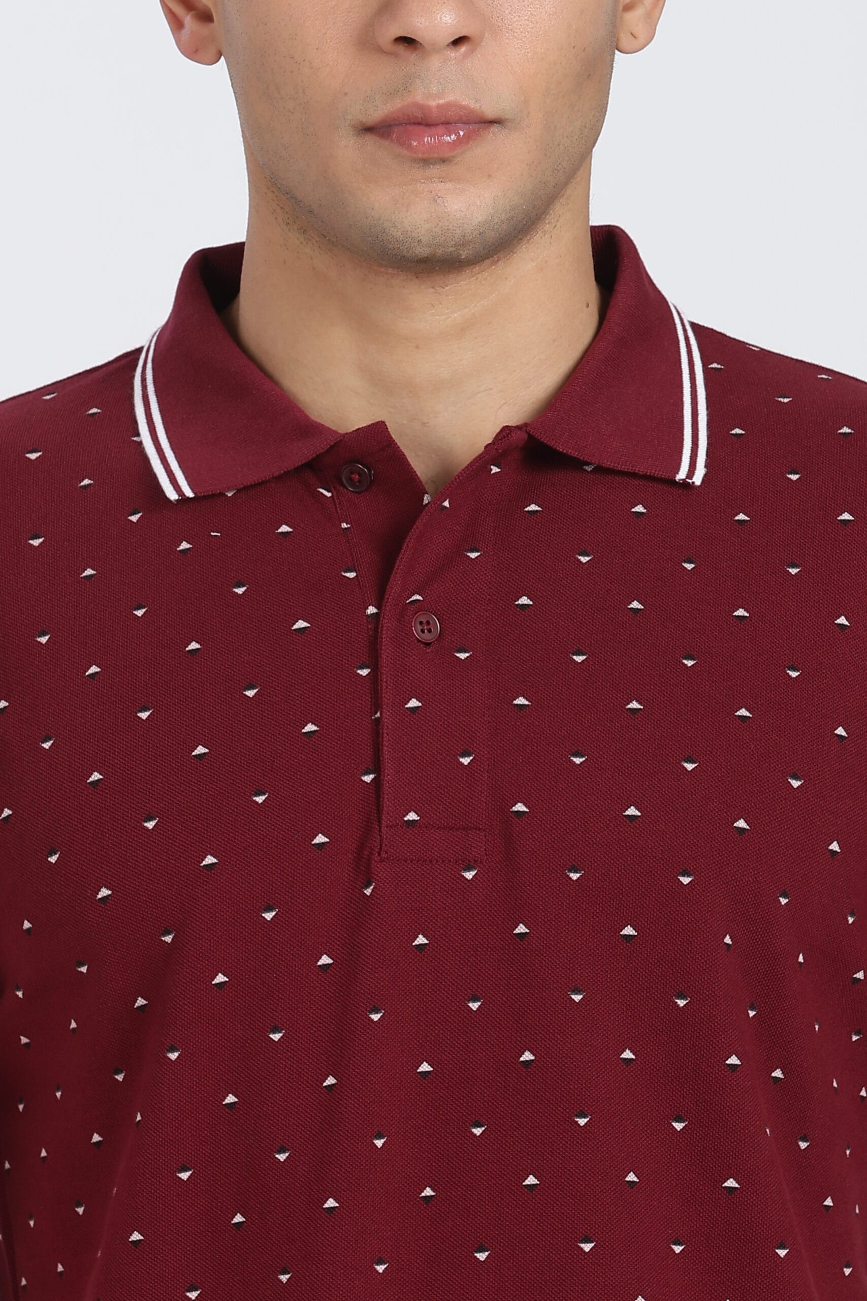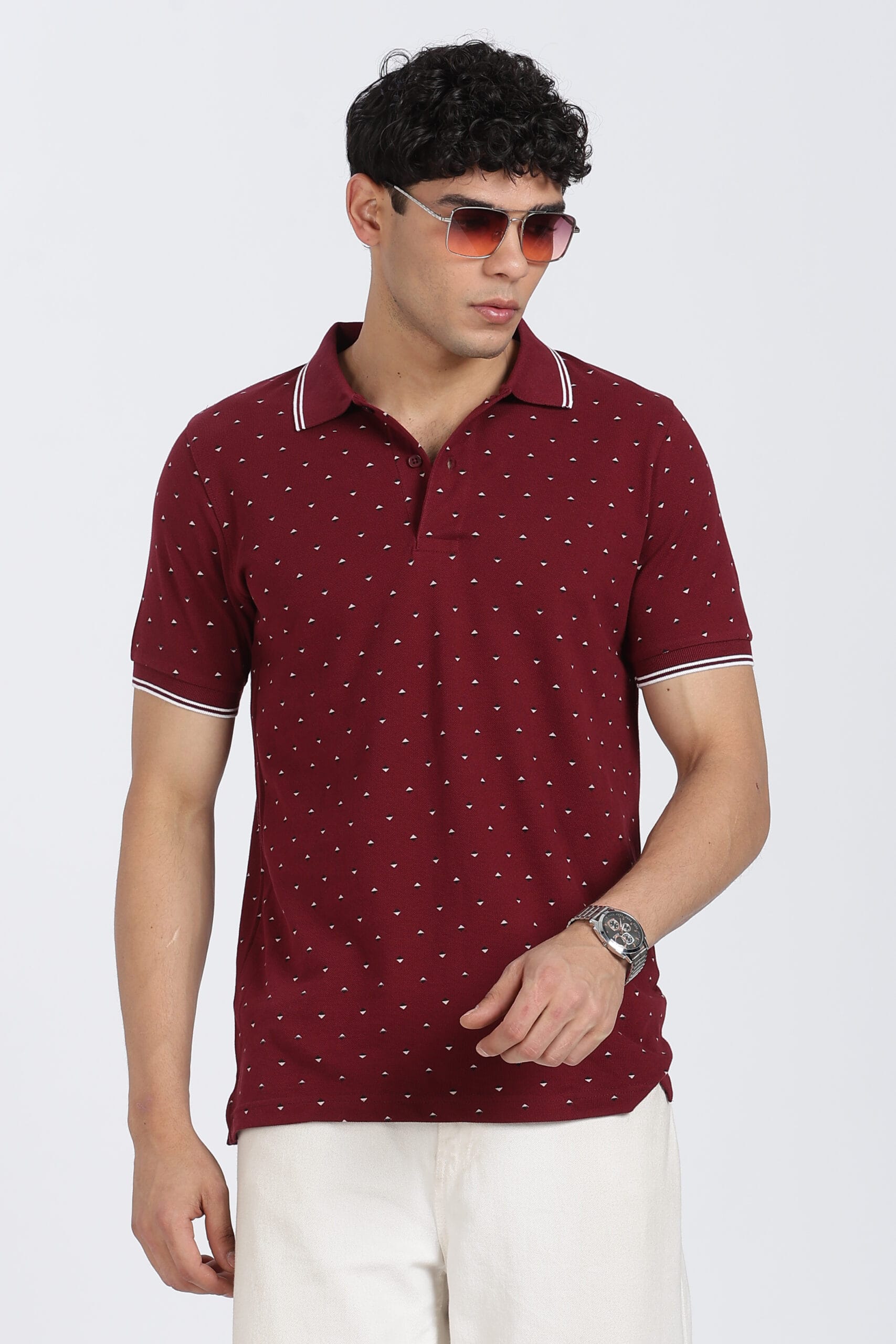 The micro geometric print design adds a refined visual texture, while the contrast tipped collar enhances the overall premium appeal. Designed with a regular fit, it provides ease of movement and a relaxed silhouette, making it perfect for daily wear.